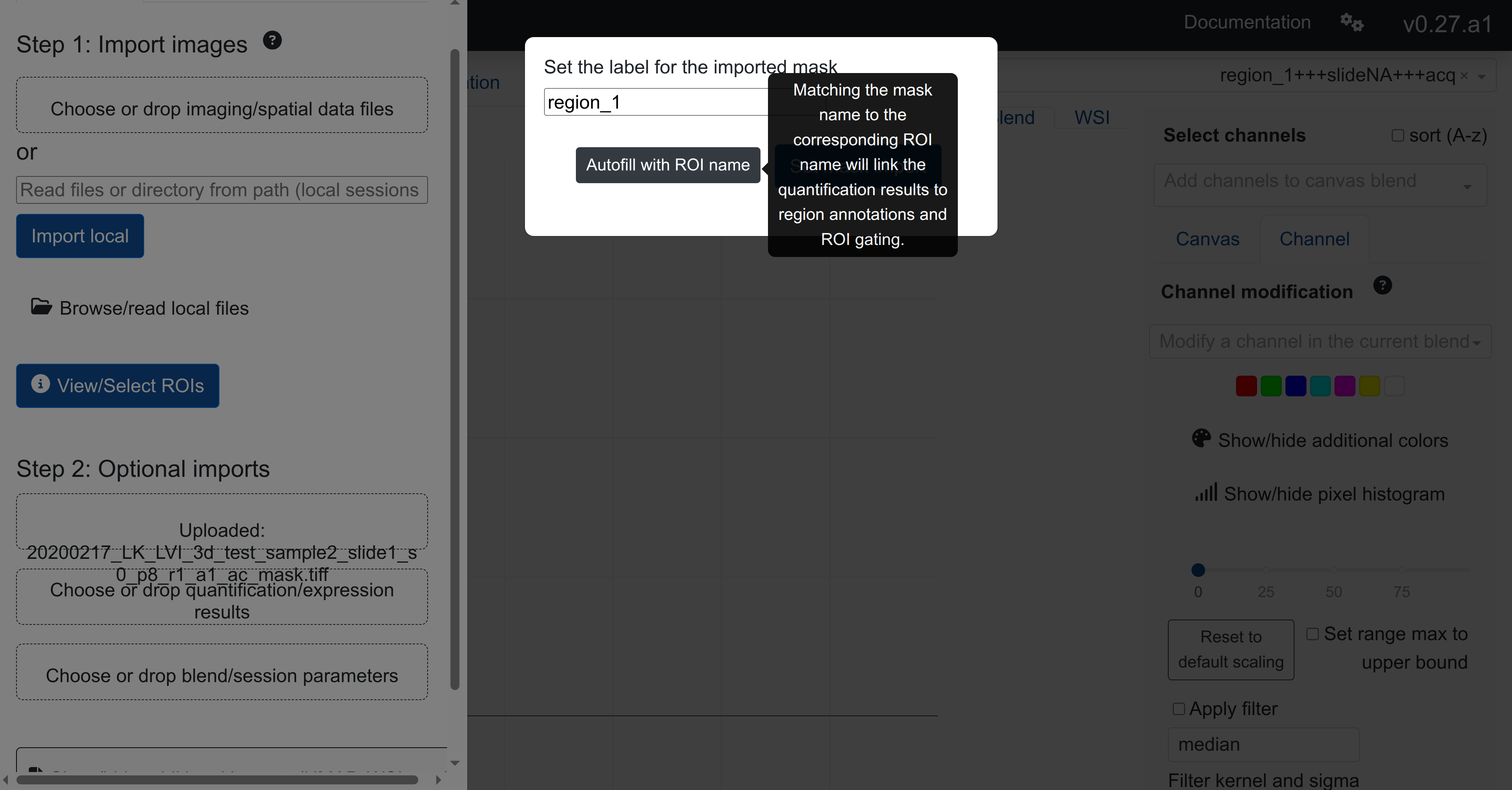 In the example above, after importing a multiplexed region named region_1 from tiff, importing the corresponding mask tiff and selecting Autofill with ROI name saves the imported mask with the same name identifier as the matched ROI.