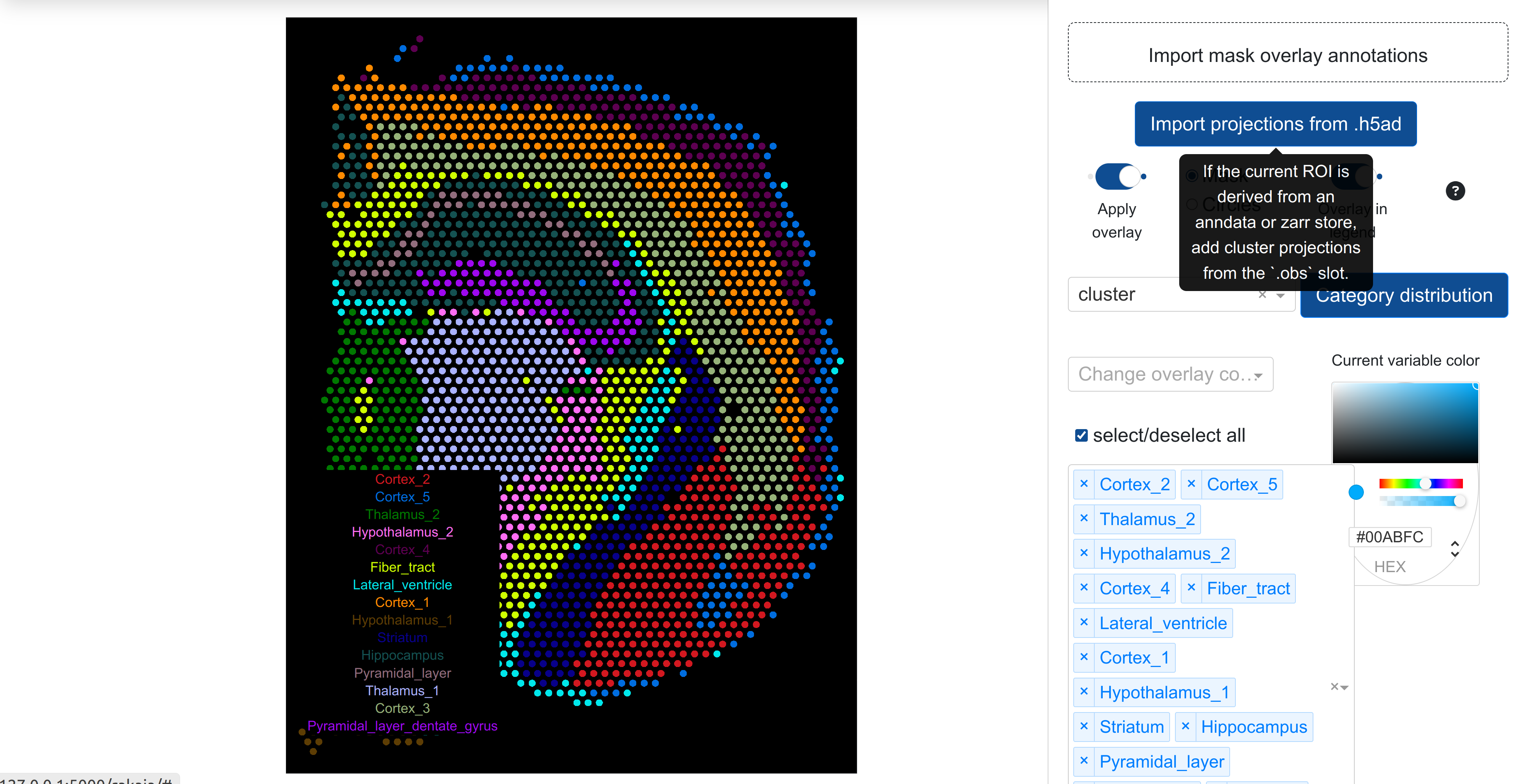 Starting in rakaia v0.25.0, the categorical variables held in the obs slot of Anndata-backed ROIs from either .h5ad files or zarr stores can be applied as an overlay projection. With the relevant ROI loaded, users should select Measure/overlay -> Import projections from .h5ad. Any categorical variables detected in the Anndata obs slot with fewer than 100 unique values will populate the overlay category dropdown as a selectable overlay.