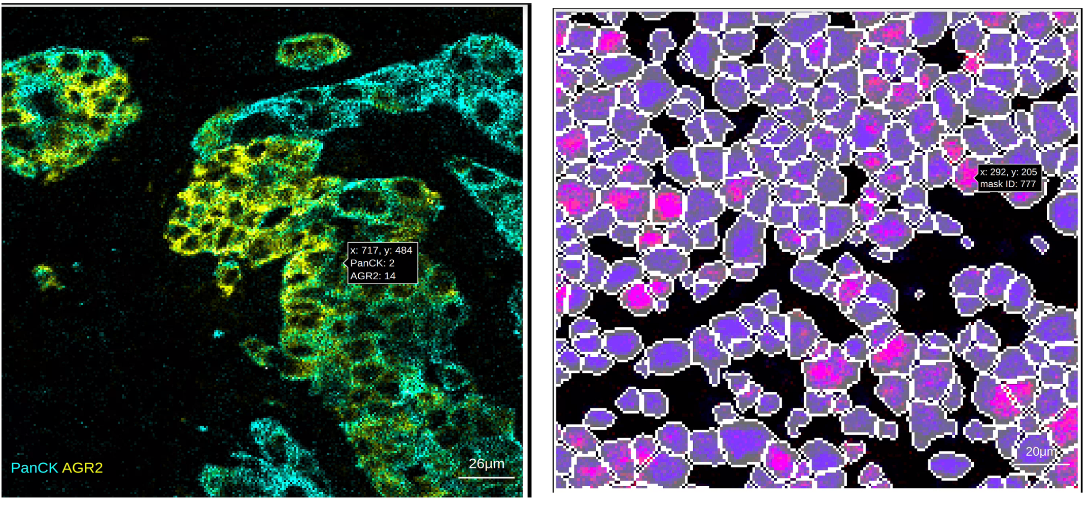 rakaia supports custom hover templates for the canvas, which modify the information displayed when the user hovers over a pixel in the canvas. By default, only the x and y-coordinates at the hover position are displayed, but users can toggle on either raw channel values for every marker in the current blend, or the mask ID for objects in a mask if a mask is applied.