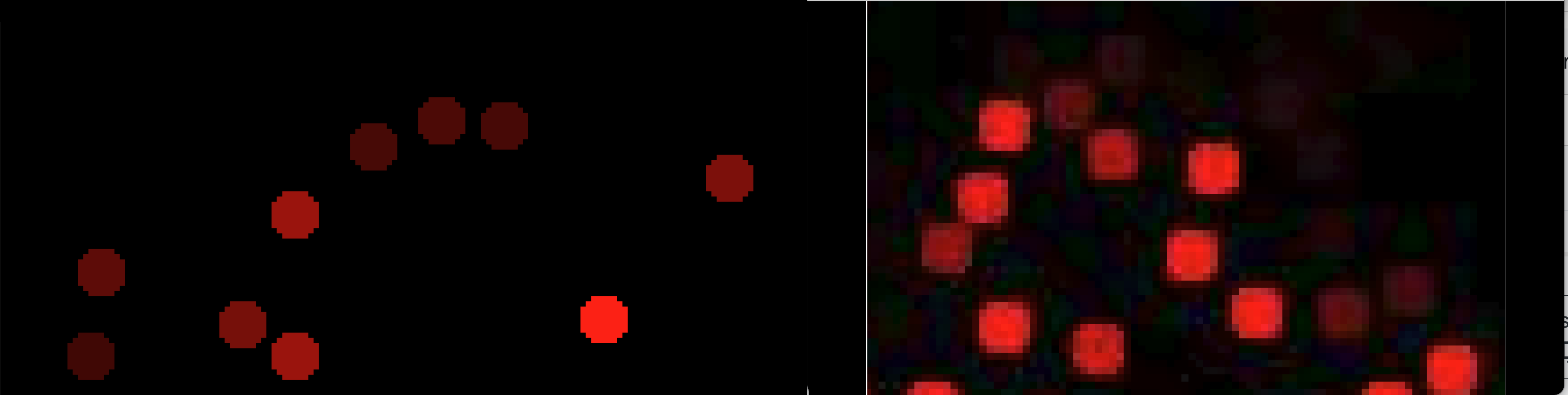 In the example on the left, we see no compression loss, as all of the pixel coresponding to individual transcript spots are the same uniform intensity, with no background color execept for red. On the right, we see the effect of lossy compression, where each transcript circle is slightly blurred/non-uniform, and there is very faint green background signal present around the spots.