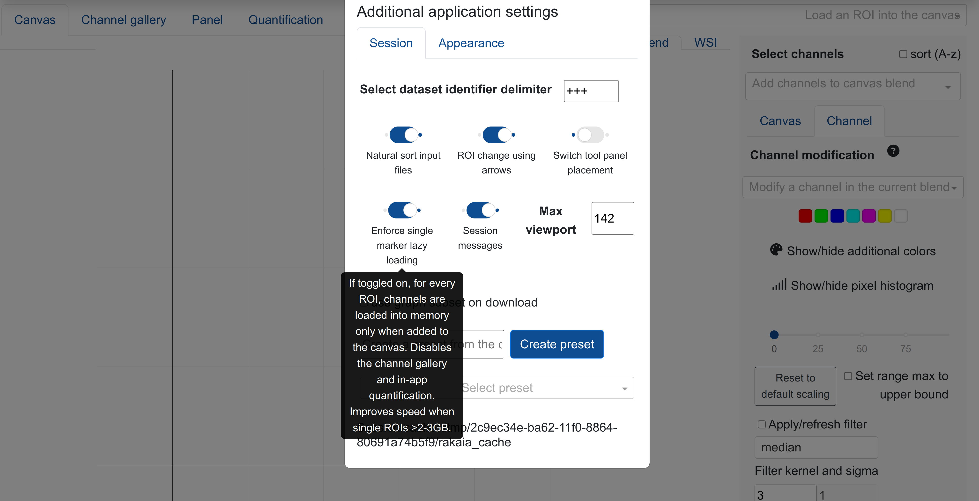 When a user selects an ROI, rakaia will attempt to compute if the entire ROI (i.e. all raw channels) can fit into memory. In situations where ROIs exceed approximately 4GB, rakaia will enforce single marker lazy loading, where channels are loaded into memory only when selected by the user to add to the canvas. This allows rakaia to be performant for the largest ROIs (i.e. a 8000x8000 region with 50 channels), but has the trade-off of disabling the channel gallery as well as in-app quantification, because these features require all ROI channels to be held in memory.