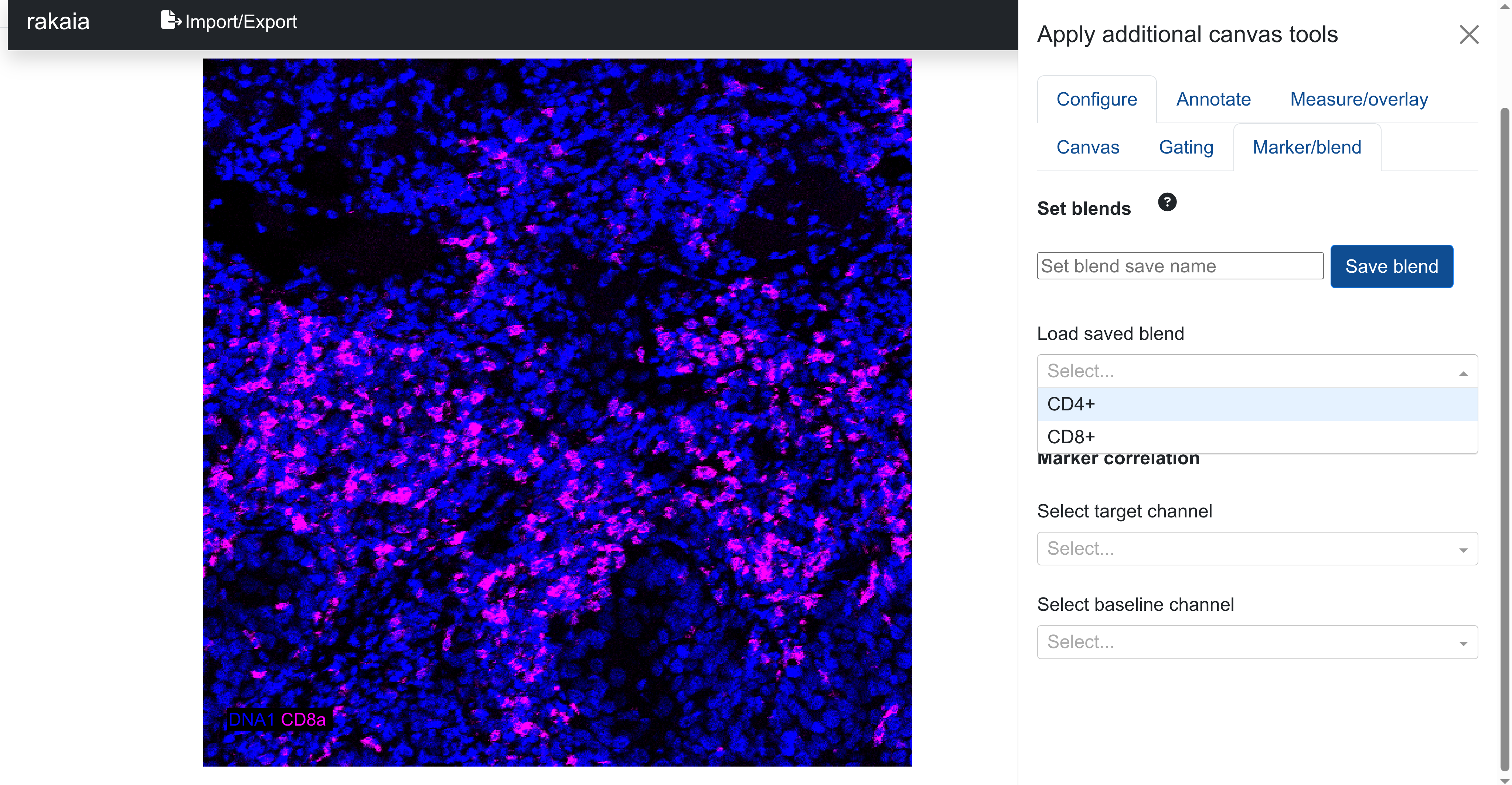 Users may wish to create sub-groupings of related markers for visual comparison, such as different groupings of overlapping immune antibodies, and be able to rapidly toggle among them in the canvas. To enable this, users can create named blends under Configure, annotate, measure, & more -> Marker/blend -> Set blends. Here, the current markers in the canvas can be saved under a unique name, and selecting a blend combination under Load blends will switch the main canvas to the channels in that grouping, such as toggling between CD8 and CD4: