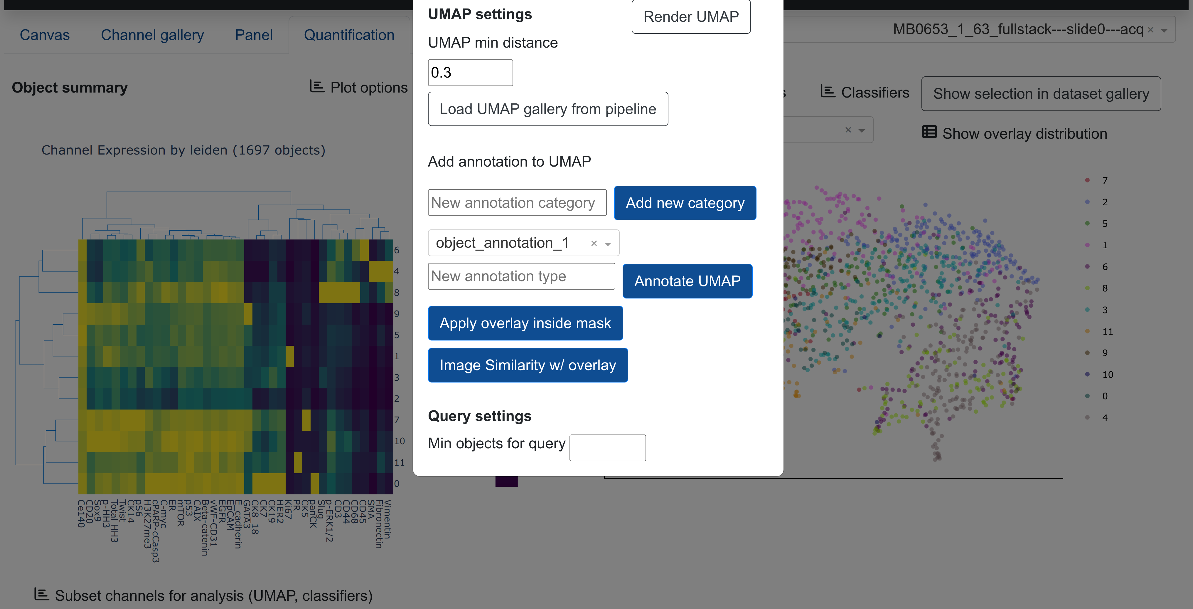 , users may upload a custom set of UMAP projections for the quantified objects, in order to eliminate the need to run the UMAP algorithm in the browser (which can be slow for large datasets and prone to browser timeouts). Additionally, users may also annotate the objects in the current view by creating new or using existing annotation categories and providing an annotation type (such as a object type or descriptive designation). The UMAP window must be zoomed in on a subset of objects for annotation to take place. The xy UMAP coordinates for the current UMAP graph can also be downloaded in CSV format.