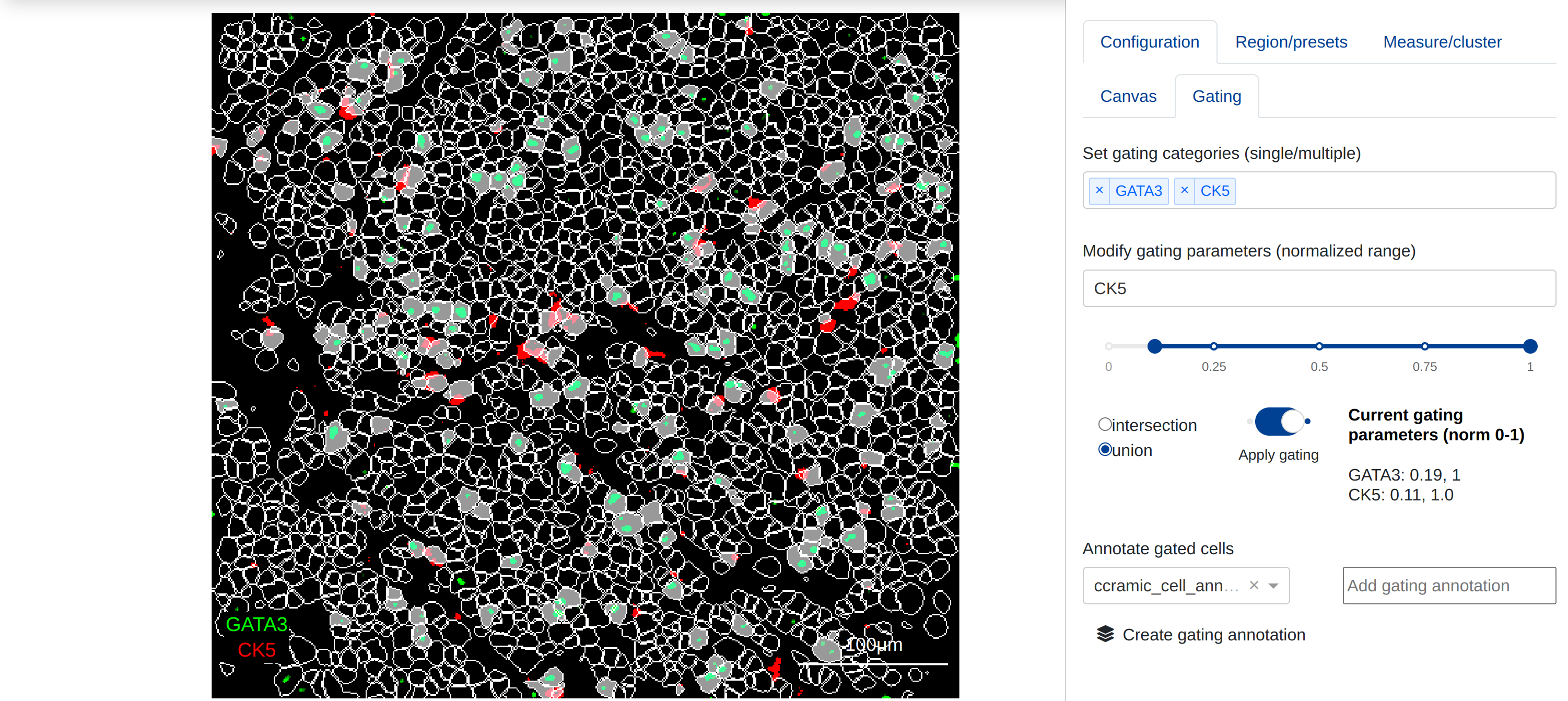 In the canvas above, objects in the mask are gated for higher expression of either GATA3 or CK5. objects not included in the gate are shown with the objet border; this can be togfled off to show just the gated objects (See Masking & Segmentation