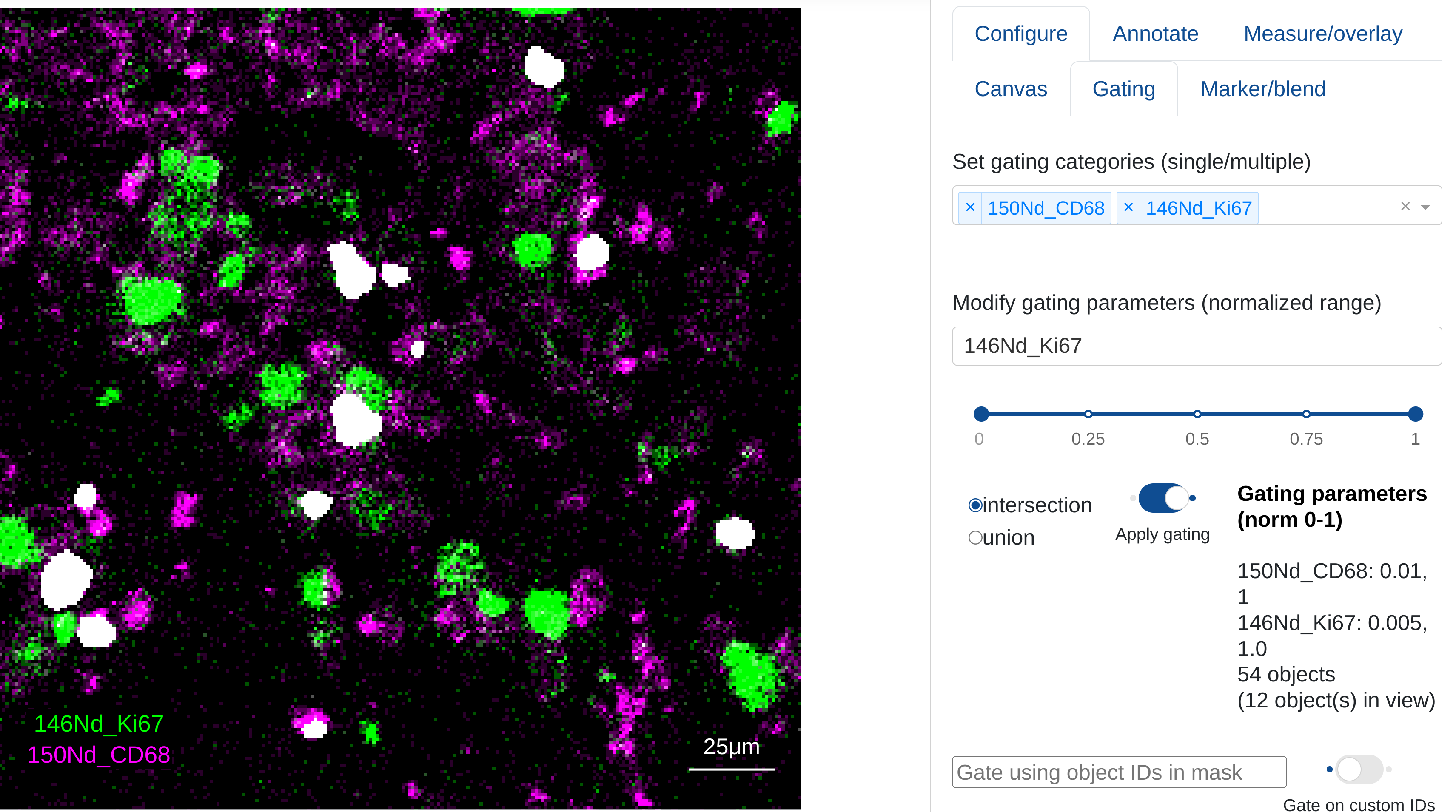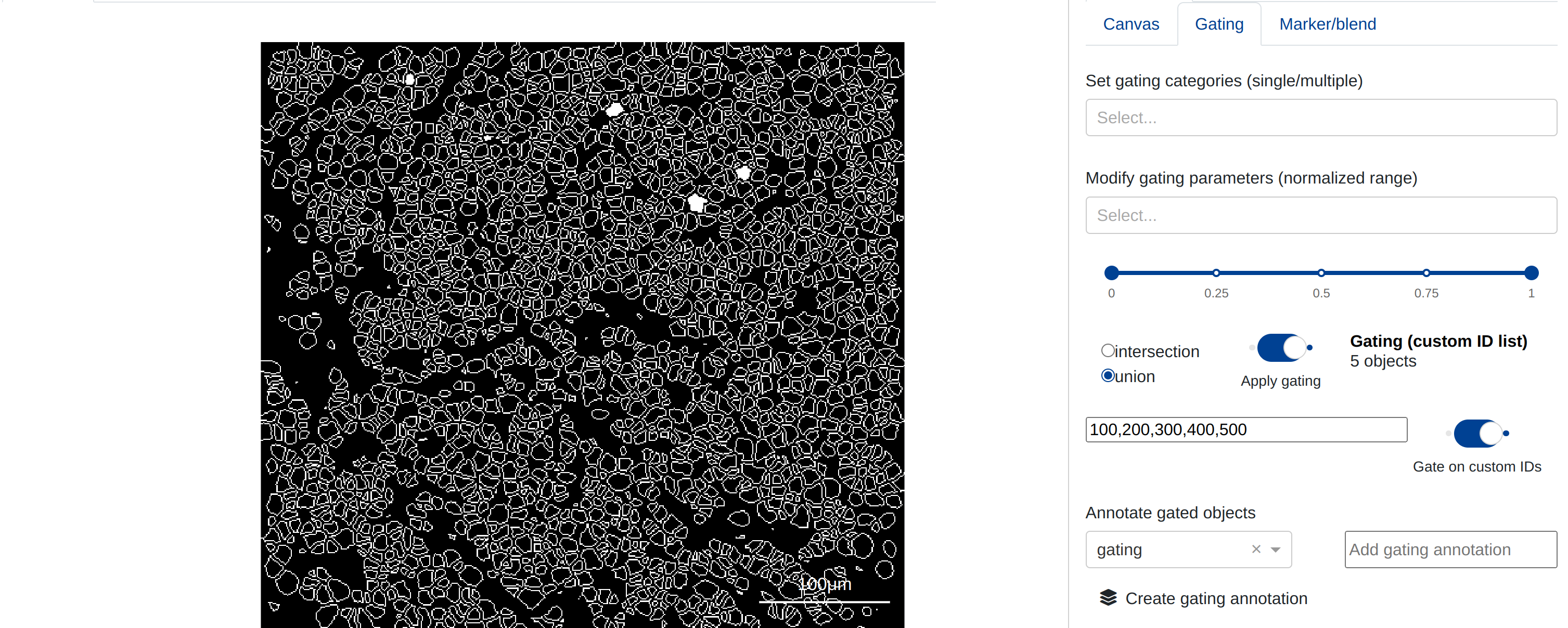 Important: in order to capture the ids of the objects associated with gating parameters, when a user annotates based on gating, the associated mask must be applied to the canvas, and the gating parameters toggled on so visually, the objects in the set are visible.