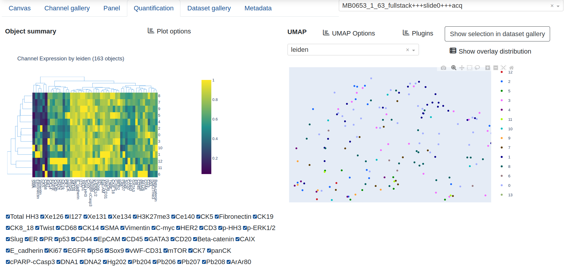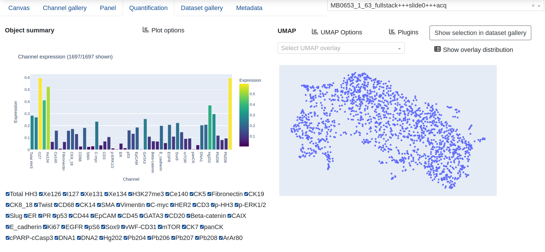Interactively zooming in on the UMAP layout will automatically trigger the channel expression summary to update with only the objects in the current view, and Show distribution