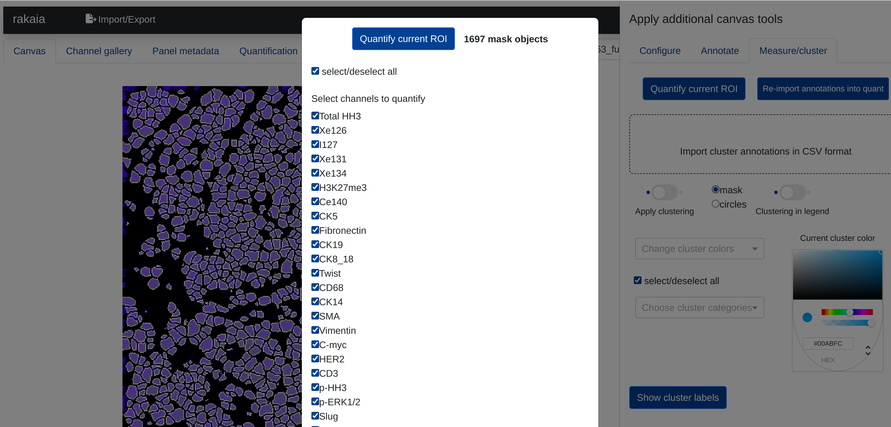rakaia provides in-browser quantification of the current ROI. Users may select quantification under Configure, annotate, measure, and more -> Measure/overlay -> Quantify current ROI
