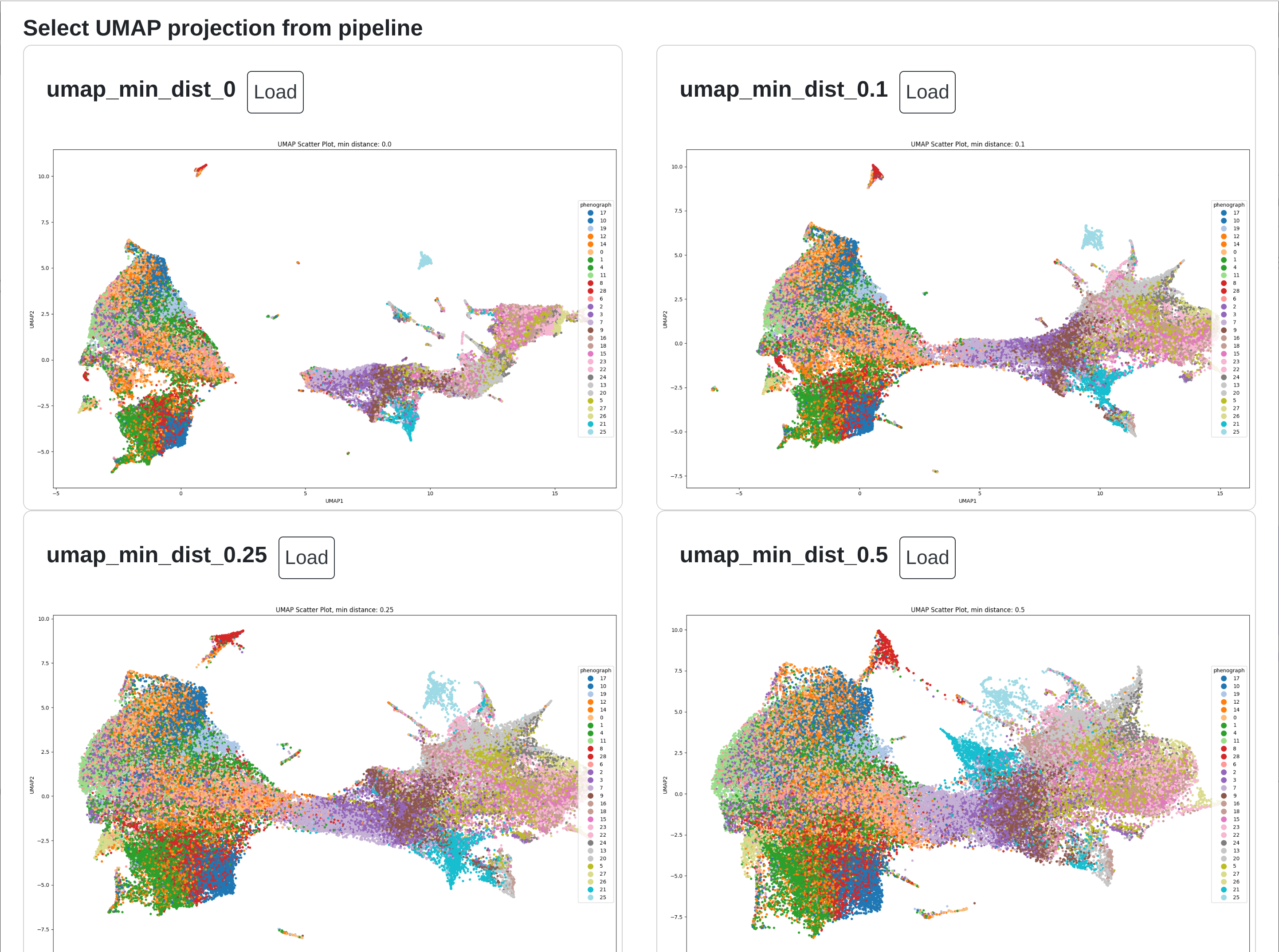 with rakaia v0.22.0, users can directly read an output directly from our snakemake steinbock pipeline v0.0.4 or greater to directly import all pipeline outputs from raw IMC data. This includes several options for UMAP projections run with different UMAP min distance metrics. These options are rendered as a UMAP gallery that the user may select, under UMAP options