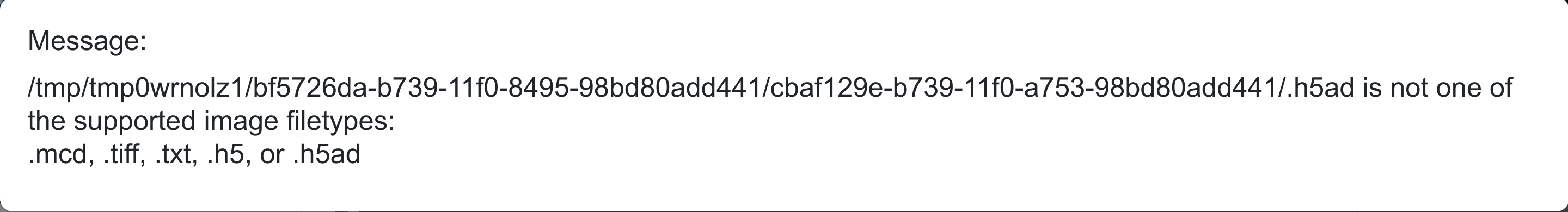 spatialdatazarrdirectory, created using the appropriate technology-specific reader fromspatialdata. This currently supports 10x Visium, Visium HD, and Xenium. More information onspatialdatafile reading can be found here - as an Anndata object with the file extension