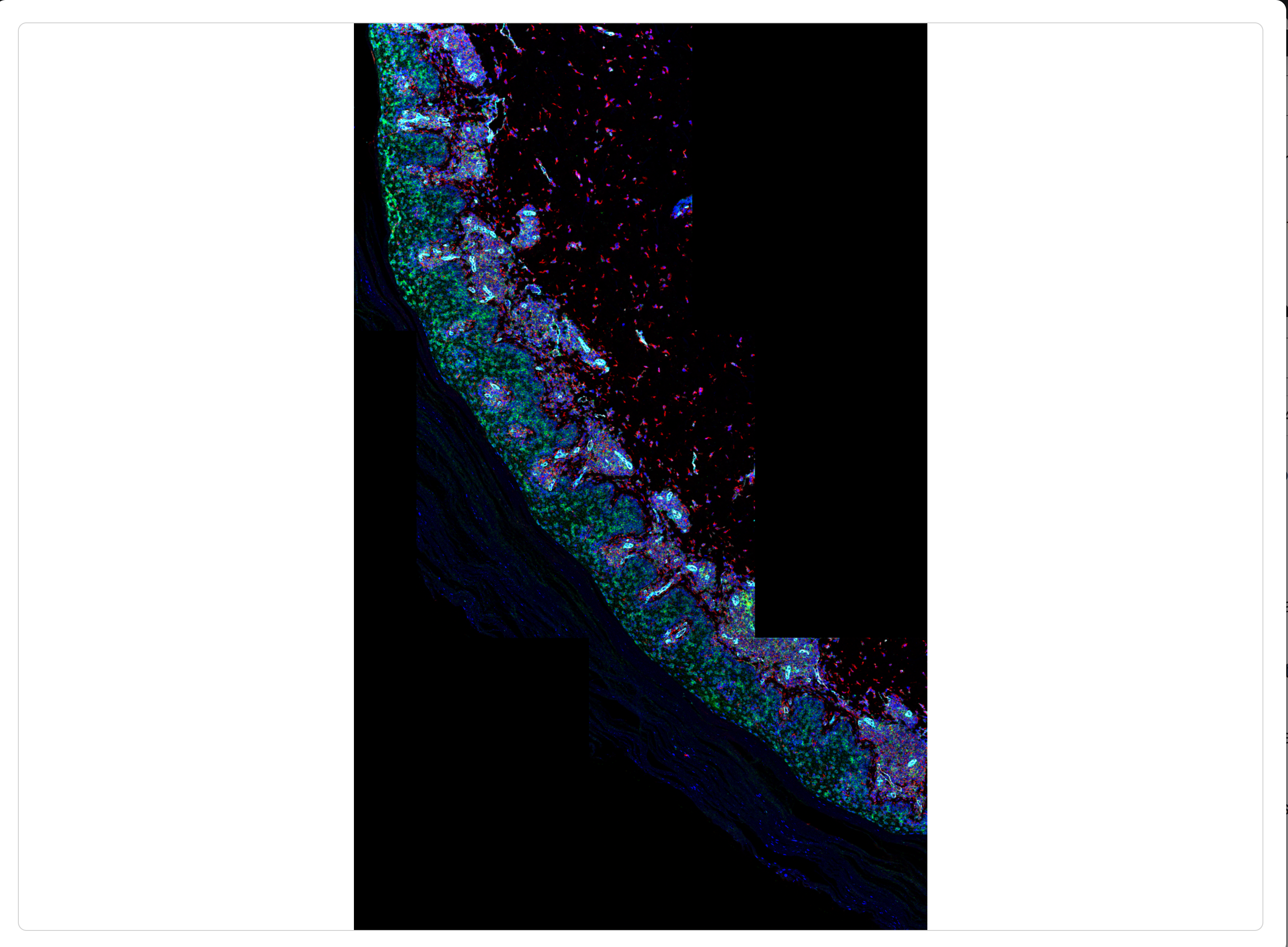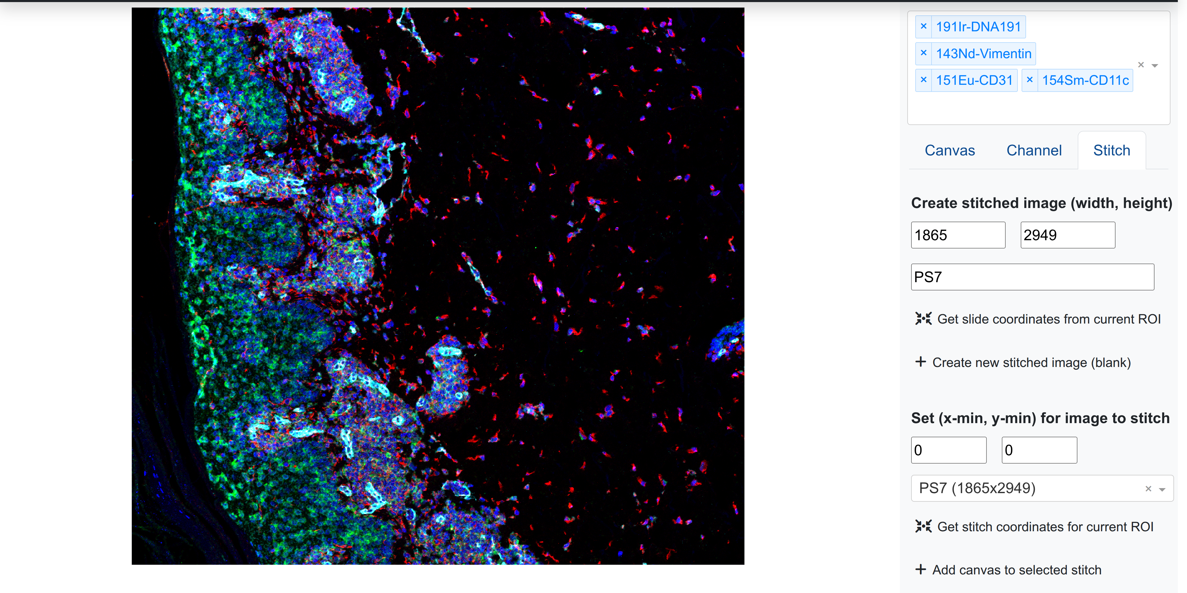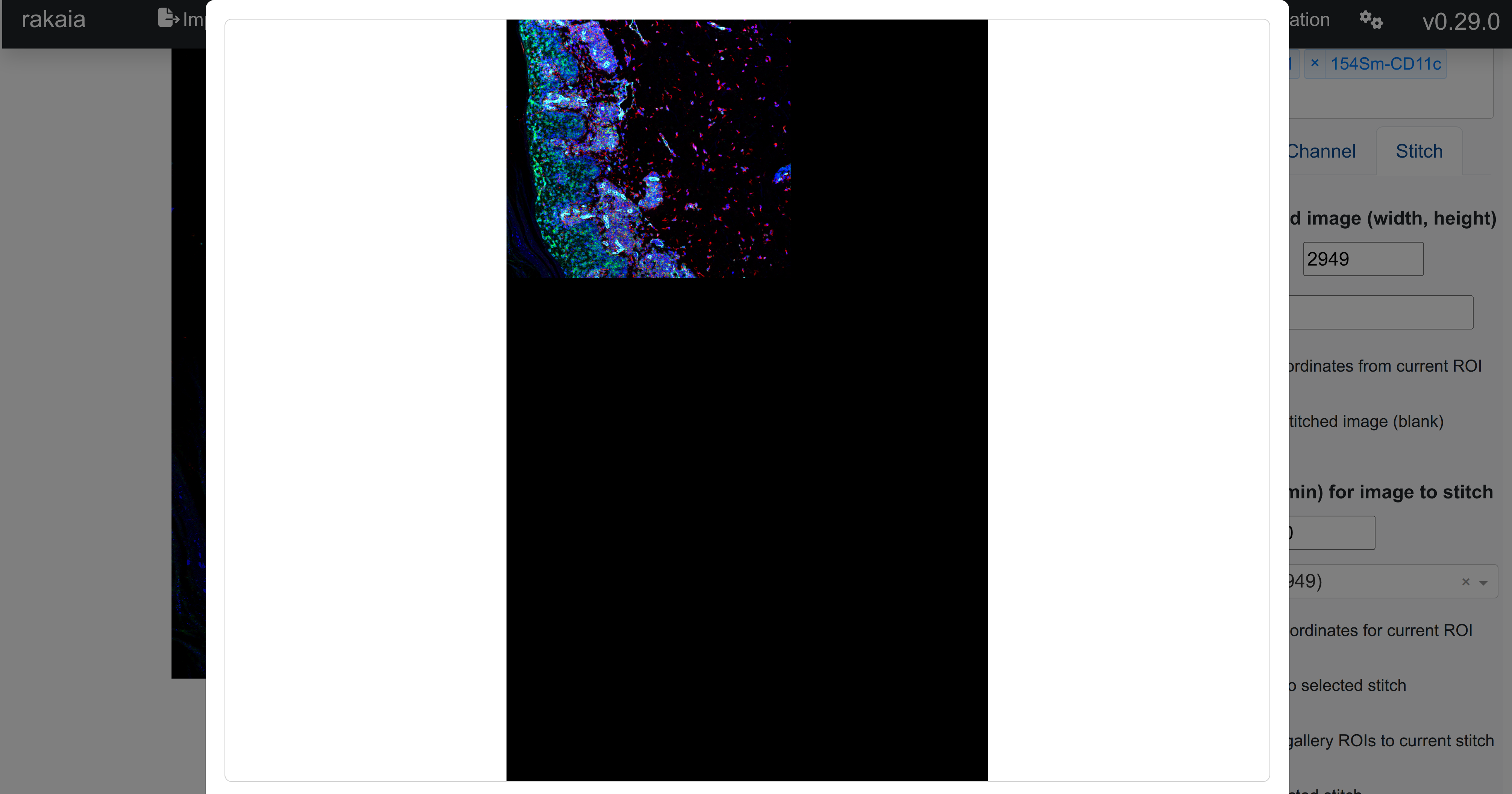 Rakaia enables image stitching for one or more blended ROIs rendered in a session, where multiple blended images can be pieced together. Images can be stitched from either the main canvas or the dataset gallery, providing an approximation of a whole slide image or image panorama using user-set channel blends.