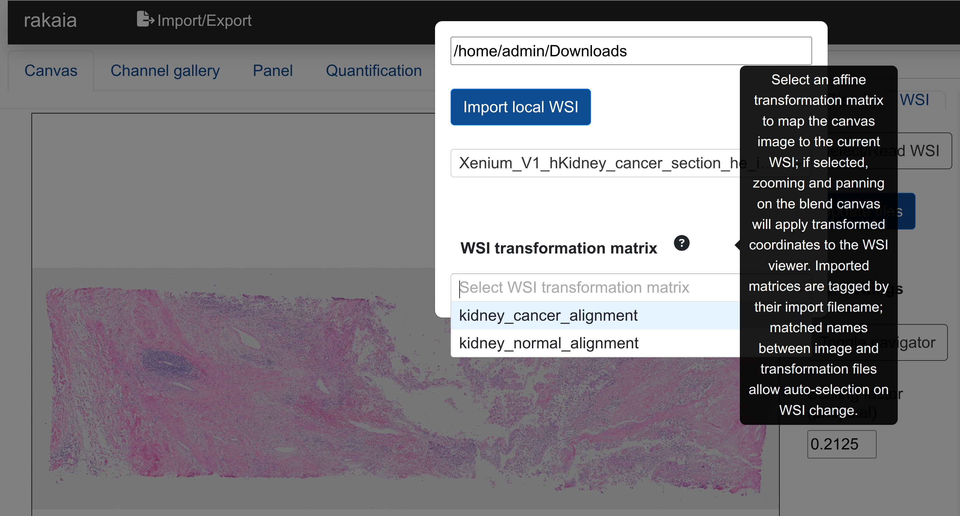Failure to have a transformation matrix selected will result in no matched zooming from the canvas to the WSI view. To assist this selection, rakaia will auto-select the corresponding transformation matrix if the file basename used to import the CSV matches the basename of the WSI import, when the matched WSI is selected from its dropdown.